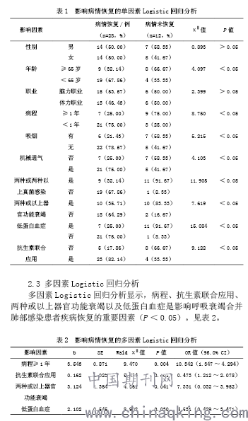 【Abstract】Objective To explore the risk factors affecting the recovery of patients with respiratory failure combined with pulmonary infection. Methods Retrospective analysis of data from 40 patients admitted to our hospital for respiratory failure complicated with pulmonary infection. Combined with literature analysis and clinical observation results, the possible influencing factors associated with the recovery of respiratory infection with lung infection were selected and analyzed. Results After treatment, the patient's condition recovery rate is 70%. Univariate analysis showed that age, course of disease, smoking, mechanical ventilation, two or more fungal infections, two or more organ failure, hypoproteinemia and the combination of antibiotics were associated with disease recovery in patients with respiratory failure ombined with pulmonary infection (P <0.05). Multifactor analysis showed that the course of disease, the combination of antibiotics, two or more organ failure and hypoproteinemia were the main influencing factors (P <0.05). Conclusion There are a lot of factors that affect the recovery of patients with respiratory failure combined with pulmonary infection, therefore, targeted interventions should be carried out according to the influencing factors.